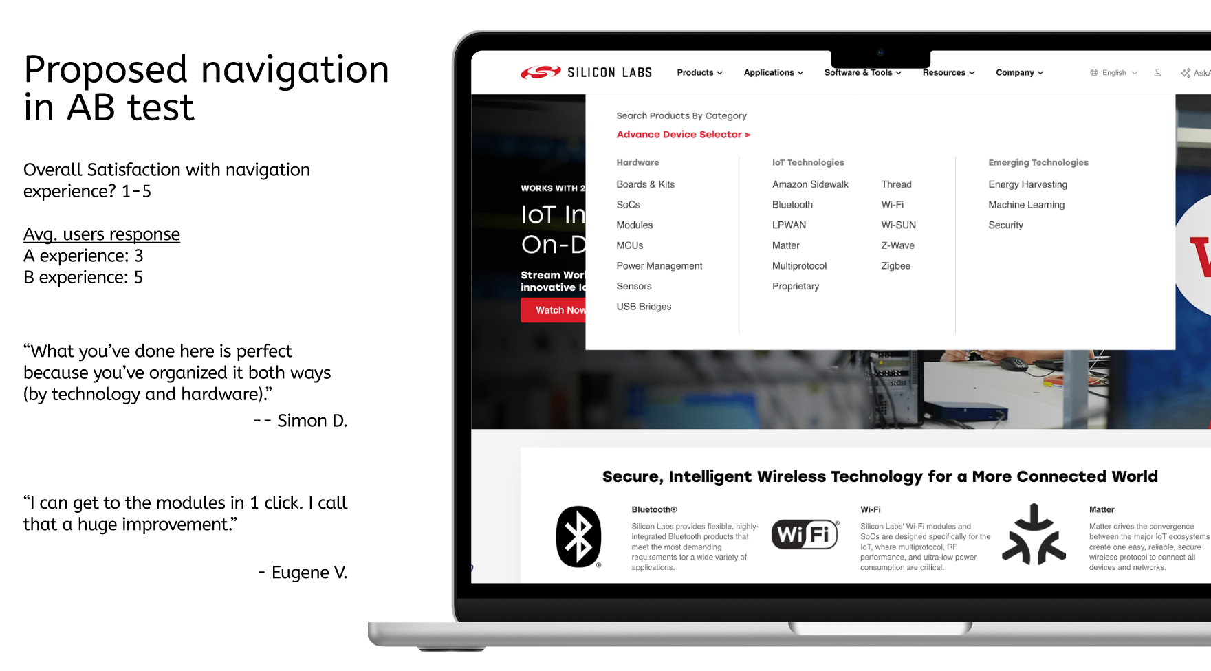 We conducted user interviews to further understand the underlying issues and discovered that the existing navigation was also creating friction between the users and their ability to find potential products. Based on these insights, we redesigned the navigation and ran an A/B test to validate the solution. The results showed a clear user preference for the updated experience over the current design.